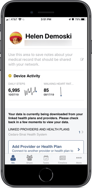 You are returned to the "Me" tab. A message displays indicating that your data is currently being downloaded from your linked provider or health plan.