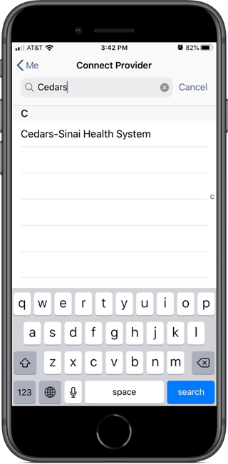 Using the resulting "Connect Provider" screen, touch the search icon (upper right), and enter the name, state, or zip code of your provider or health plan to filter the list.