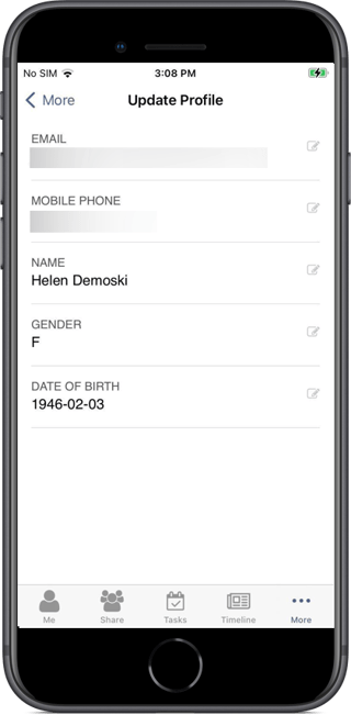 - Touch the item you would like to update (NAME, GENDER, or DATE OF BIRTH).