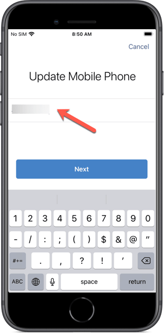 - Your updated mobile phone number displays on the "Update Profile" screen.